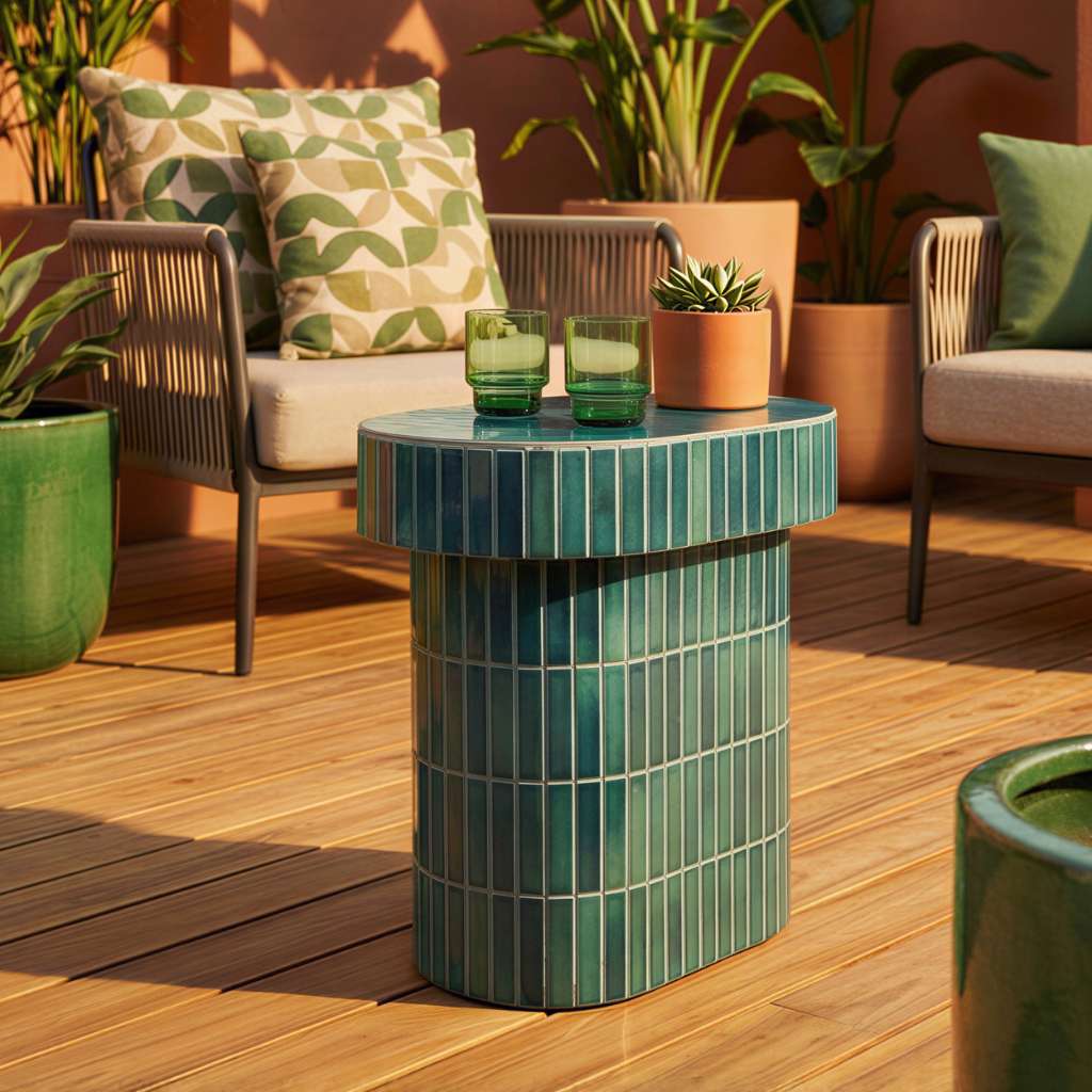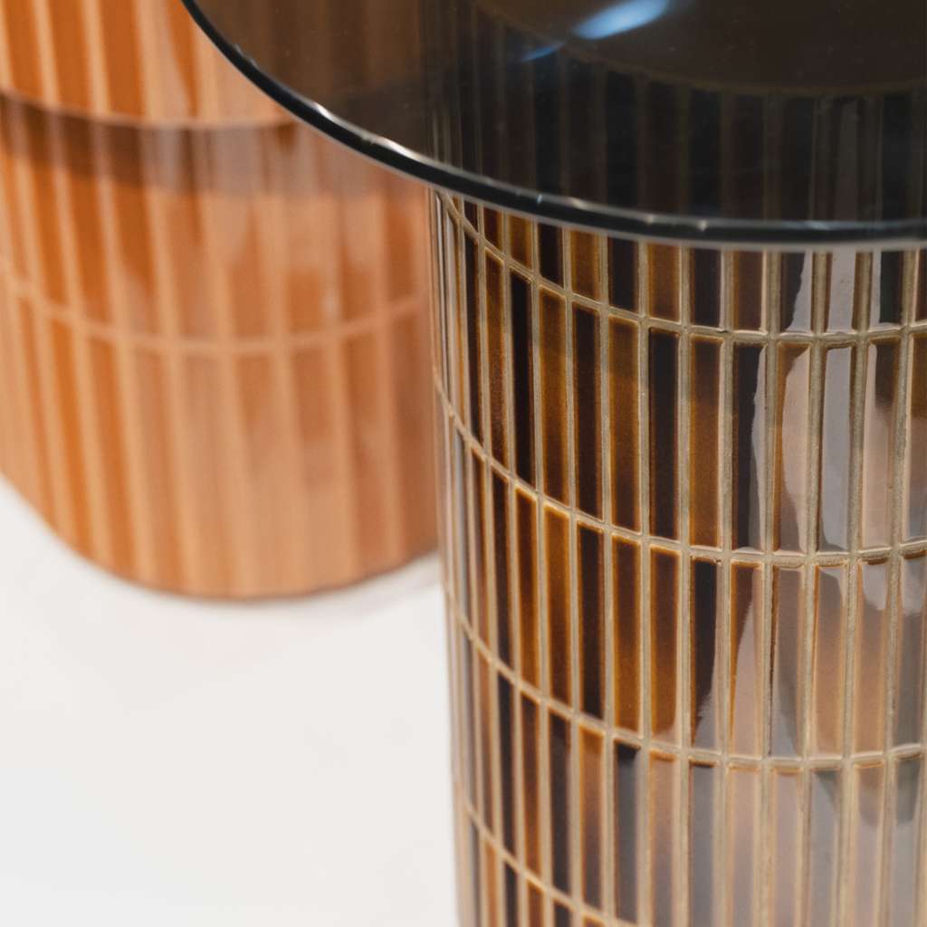 The cast concrete base provides a strong architectural foundation. Vertical ceramic tiles introduce texture and rhythm, while the glazed finishes add colour and depth. Smoked glass tops complete the design, balancing the weight of the base with a lighter visual finish.