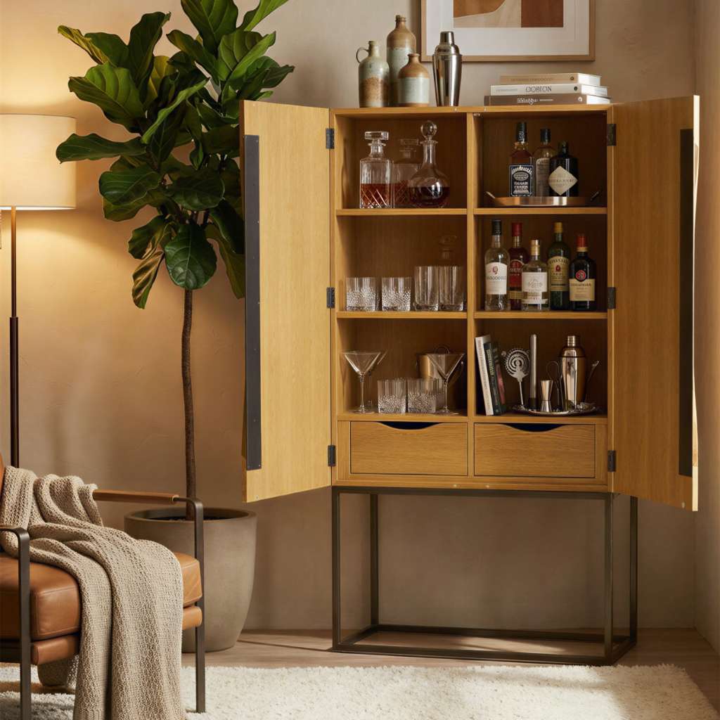 Inside, Northey is built for practical use. Shelving, drawers and generous storage create a flexible bar cabinet that works equally well for drinks, glassware or general living storage. It’s designed for real homes and strong retail appeal.