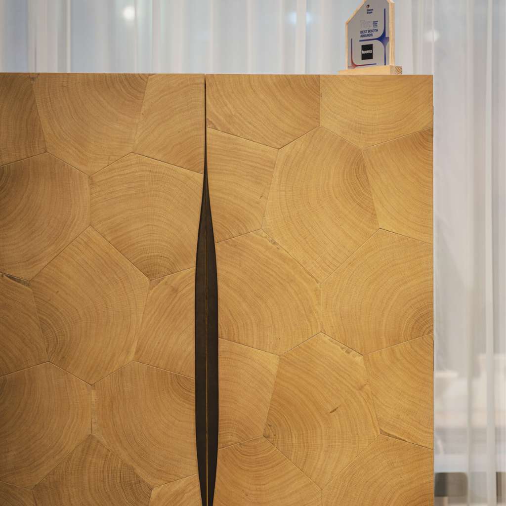 The Northey bar cabinet begins with carefully selected oyster cut oak veneers. Each section is chosen for character, then arranged to create a bold, natural pattern across the doors. No two cabinets are identical. The grain forms a striking front that feels both architectural and organic.