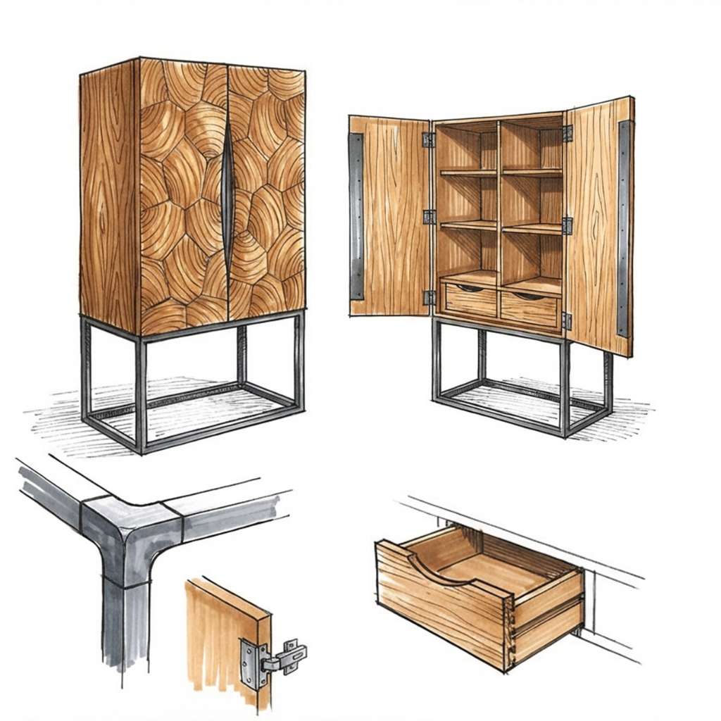 The design balances visual impact with restraint. A slim metal frame lifts the cabinet, giving it a lighter footprint and a clean, modern profile. The result is a piece that stands confidently in a room without overwhelming it.